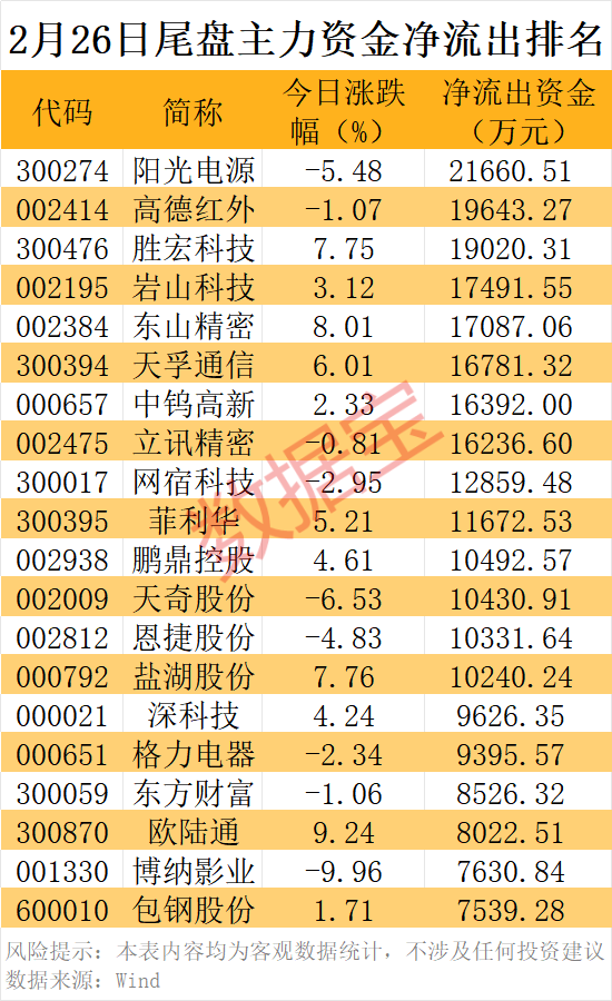 从尾盘净流出来看,14股尾盘主力资金净流出均超1亿元,其中阳光电源尾盘净流出金额居首,达到2.17亿元;高德红外、胜宏科技、岩山科技、东山精密等尾盘净流出金额均超1.7亿元。
