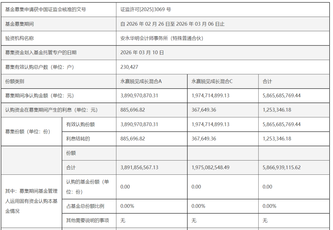 3月11日,永赢锐见成长混合基金发布基金合同生效公告,发行规模为58.67亿元,募集有效认购总户数为230427户。这是2022年以来,认购户数最多的主动权益类基金。