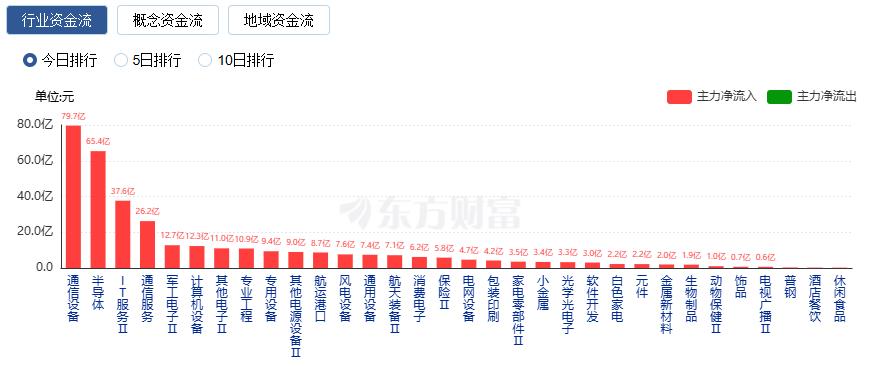 行业资金方面,截至收盘,通信设备、半导体、IT服务等净流入排名靠前,其中通信设备净流入79.65亿。