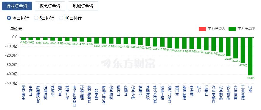 净流出方面,电池、工业金属、光伏设备等净流出排名靠前,其中电池净流出41.16亿元。