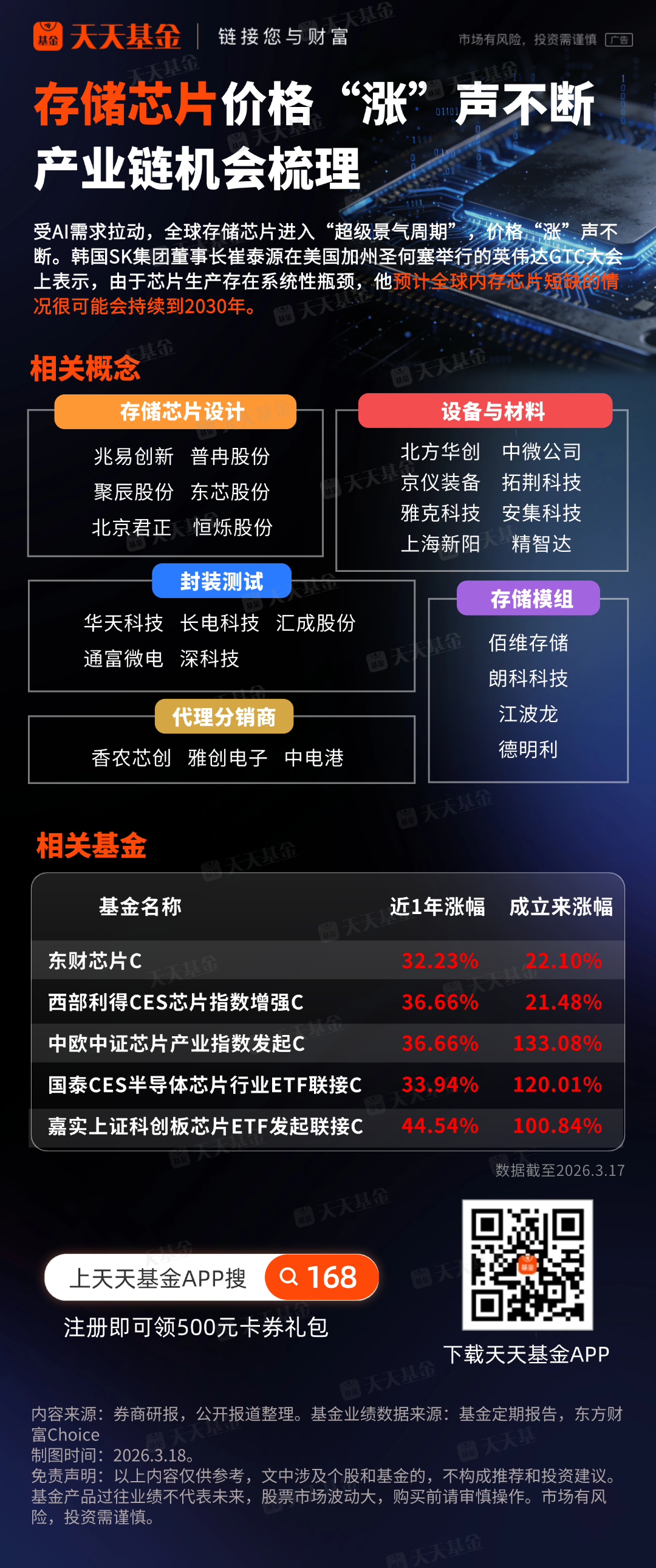 在隔夜美股存储概念大涨的带动下,3月18日,存储芯片概念股大涨,同有科技、深科达、西测测试、朗科科技20cm涨停,广合科技、中电港、诚邦股份涨停。