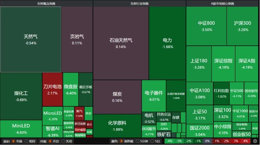 盘面上,刀片电池板块表现不俗,而石油天然气、煤化工、页岩气微跌,电子器件、智谱AI、休闲服务等板块跌逾6%。