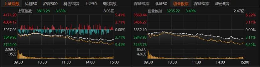 A股今日低开低走,全线大跌。沪指盘中一度跌破3800点,最后收跌3.63%报3813.28点,日内掉了143.77点;创业板指收跌3.49%报3235.22点;深证成指收跌3.76%。科创50跌逾4%,北证50跌逾5%,沪深300、上证50跌幅超过3%。
