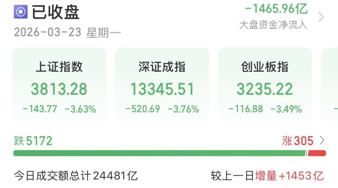 3月23日,A股全天低迷,放量大跌,关键指数跌逾3%,5172只个股收跌,日成交额增至2.45万亿元。
