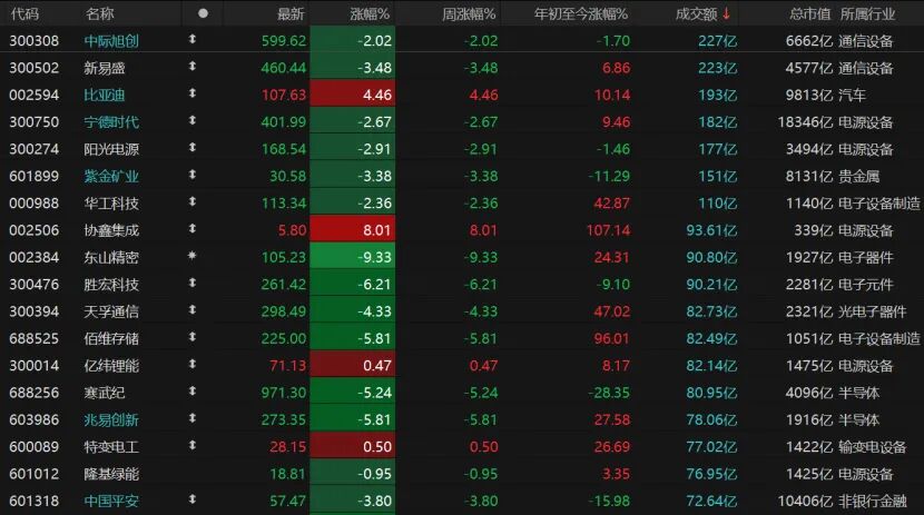 亏钱效应明显,全市场仅305只个股收涨,涨停股38只;5172只个股收跌,跌停股133只。活跃股方面,今日仅7只个股日成交额超过100亿元,华工科技、紫金矿业、阳光电源、宁德时代、中际旭创、新易盛均下跌,仅比亚迪逆市涨逾4%。