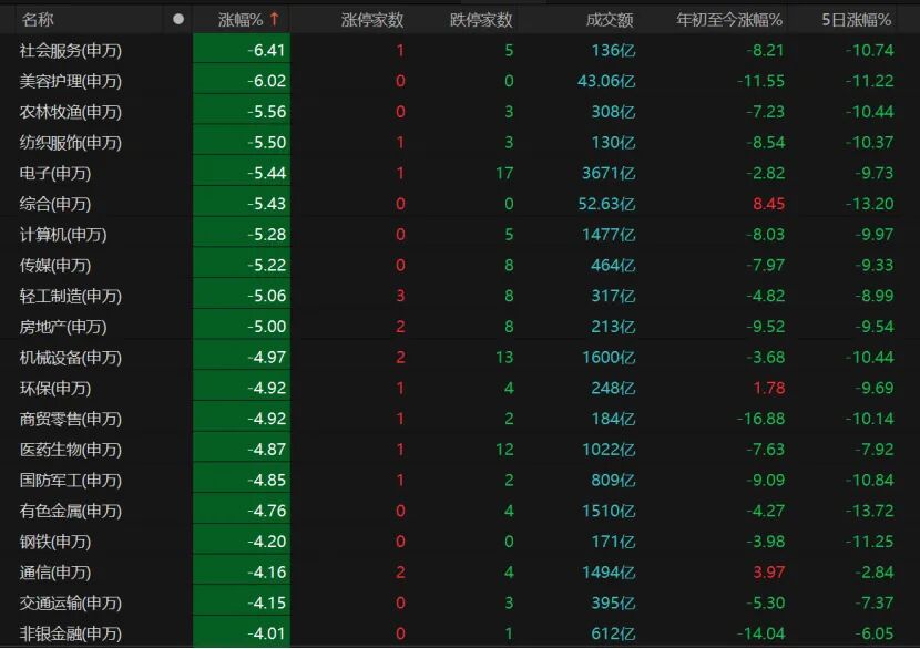 31个申万一级行业中,仅煤炭、石油石化微红,公用事业、电力设备、汽车、基础化工跌幅低于3%。20个板块跌幅在4%以上,社会服务、美容护理板块跌逾6%,农林牧渔、纺织服饰、电子、综合、计算机板块均大跌。