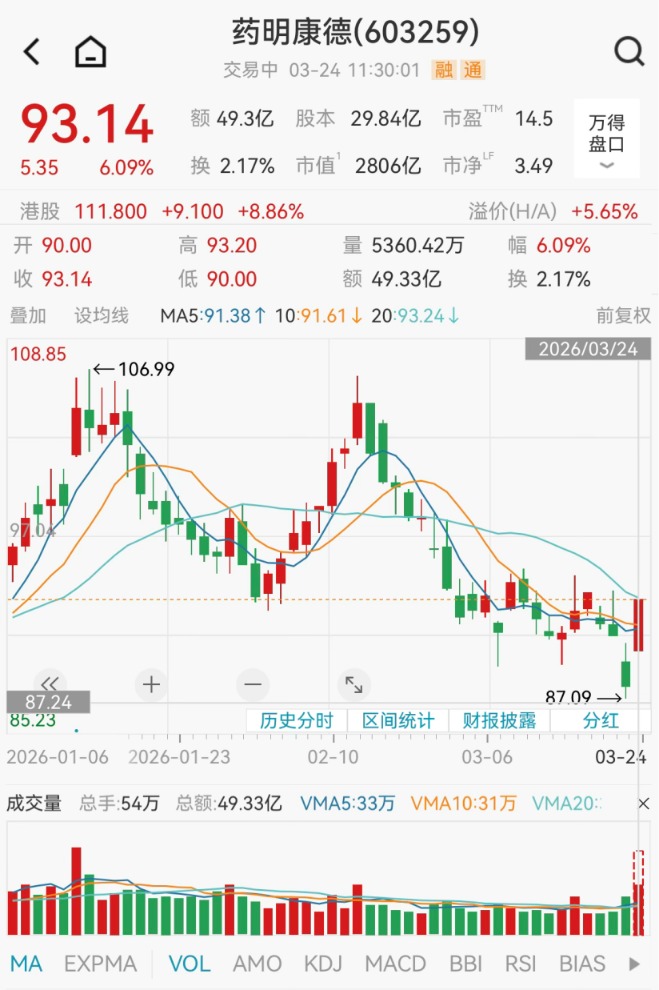 药明康德涨超6%,最新报93.14元/股,总市值为2806亿元。