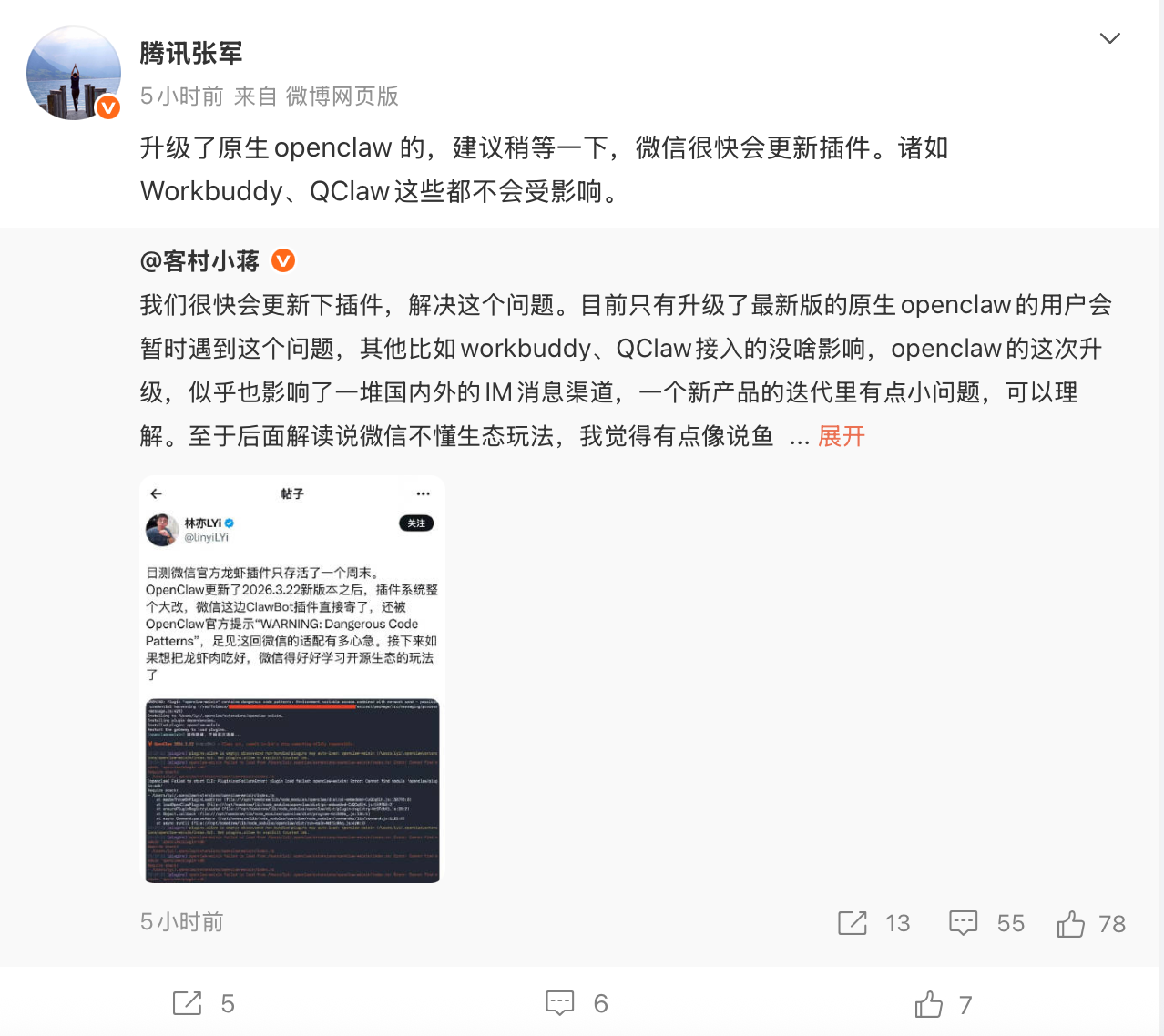 腾讯公司公关总监张军也转发回应道:“升级了原生OpenClaw的,建议稍等一下,微信很快会更新插件。诸如Workbuddy、QClaw这些都不会受影响。”