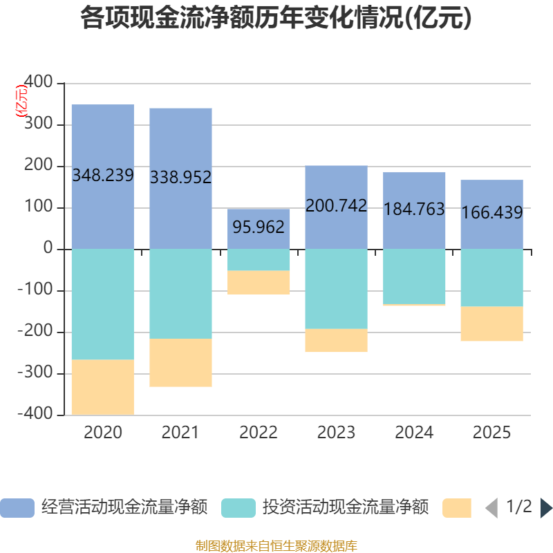 截至2025年,公司经营活动现金流净额为166.44亿元,同比下降9.92%;筹资活动现金流净额-82.98亿元,同比减少79.12亿元;投资活动现金流净额-139.34亿元,上年同期为-133.26亿元。