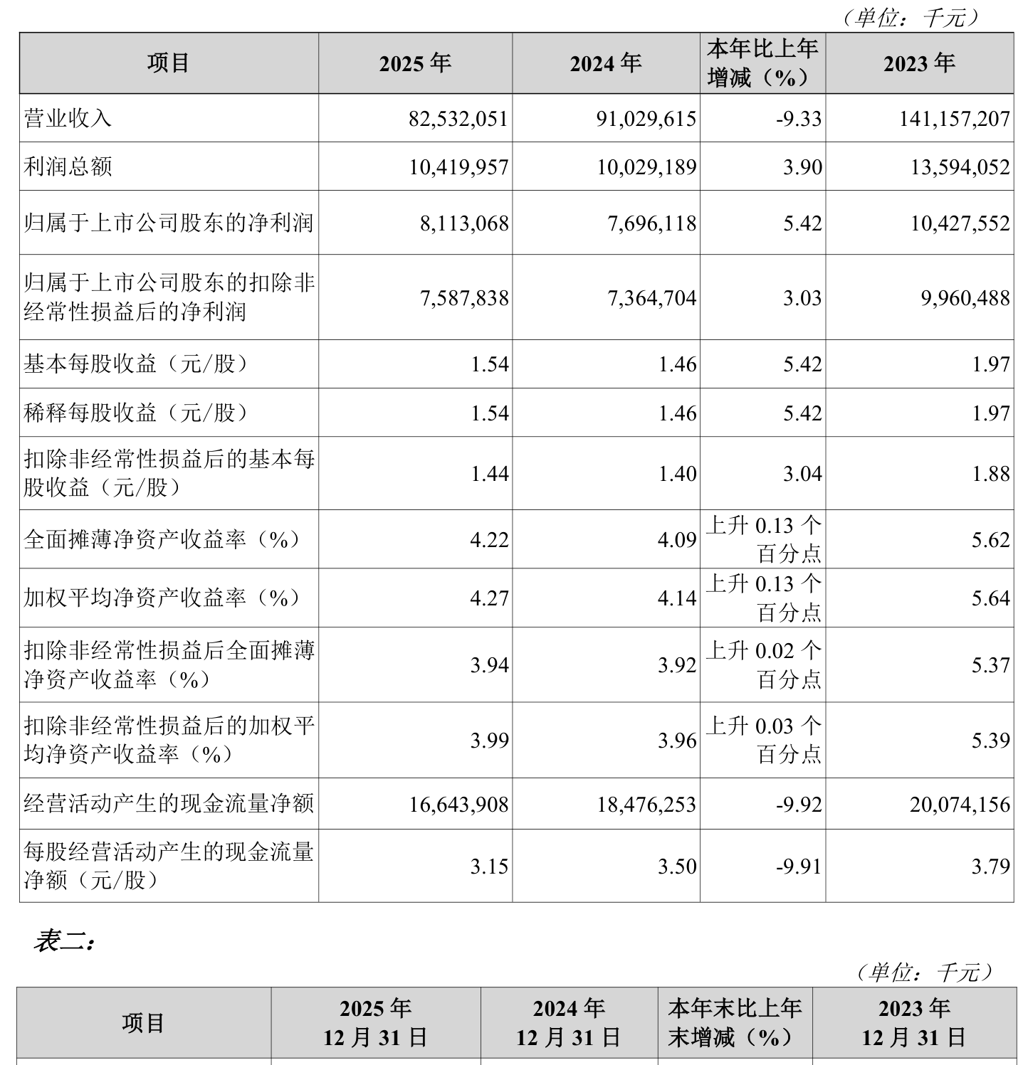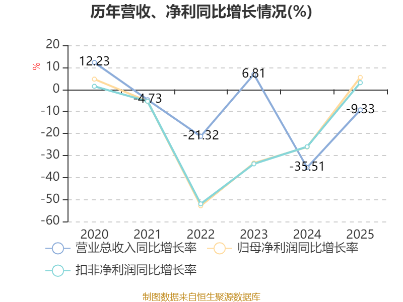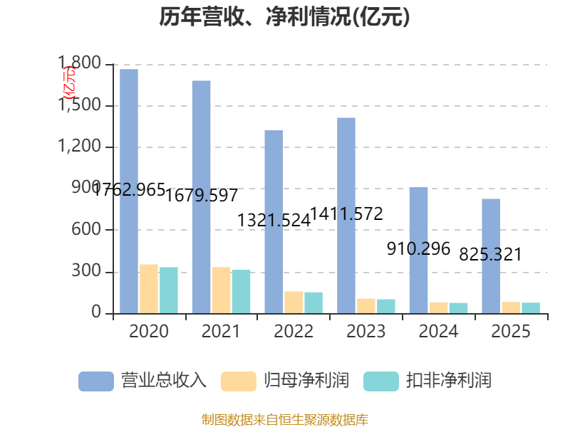 中证智能财讯海螺水泥(600585)3月25日披露2025年年度报告。2025年,公司实现营业总收入825.32亿元,同比下降9.33%;归母净利润81.13亿元,同比增长5.42%;扣非净利润75.88亿元,同比增长3.03%;经营活动产生的现金流量净额为166.44亿元,同比下降9.92%;报告期内,海螺水泥基本每股收益为1.54元,加权平均净资产收益率为4.27%。公司2025年度分配预案为:拟向全体股东每10股派现6.1元(含税)。