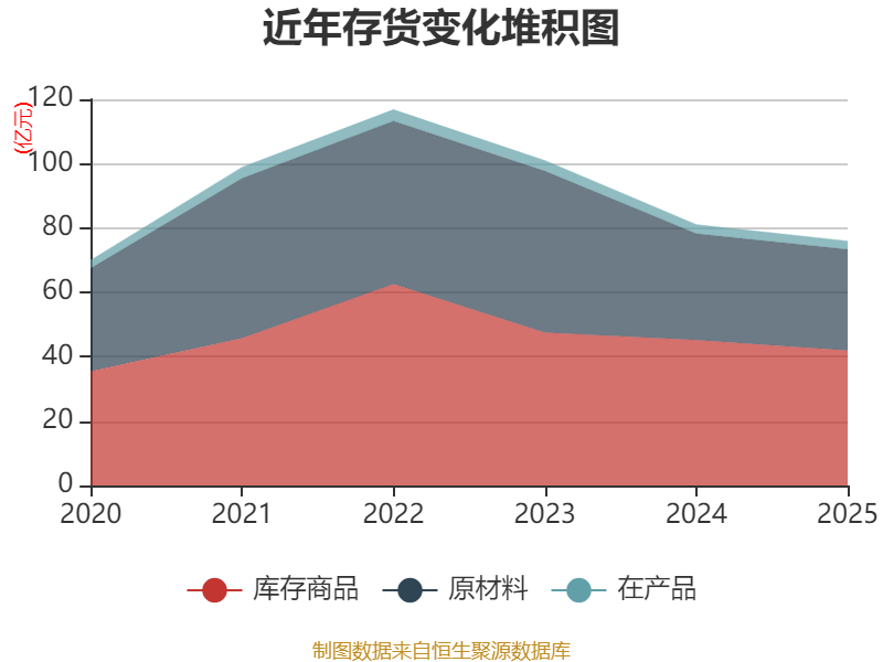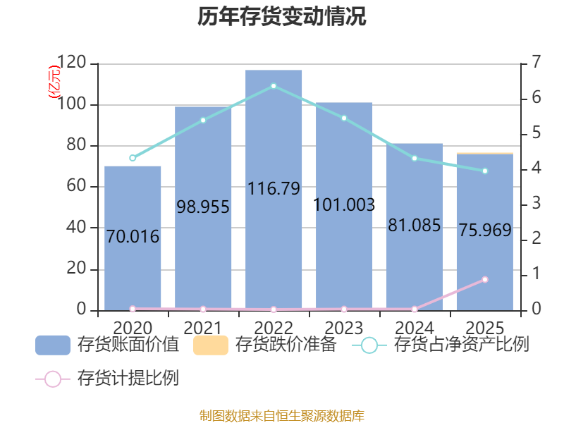 从存货变动来看,截至2025年末,公司存货账面价值为75.97亿元,占净资产的3.95%,较上年末减少5.12亿元。其中,存货跌价准备为6630.98万元,计提比例为0.87%。