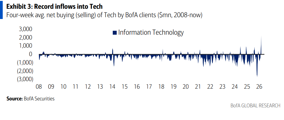 美银证券股票与量化策略师Jill Carey Hall在最新的每周资金流向报告中记录了这次"广谱性抛售"——11个板块中有9个遭遇净流出,金融、能源、可选消费、必需消费、公用事业、材料均录得创纪录或接近纪录的流出,通讯服务则是去年12月底以来首次出现净流出。唯一的例外是科技股:净流入46亿美元,创下美银2008年以来数据的历史最高单周纪录。