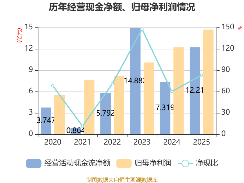 截至2025年,公司经营活动现金流净额为12.21亿元,同比增长66.83%;筹资活动现金流净额-1.76亿元,同比减少7.29亿元;投资活动现金流净额-10.88亿元,上年同期为-11.15亿元。
