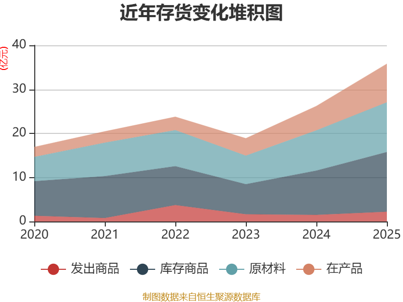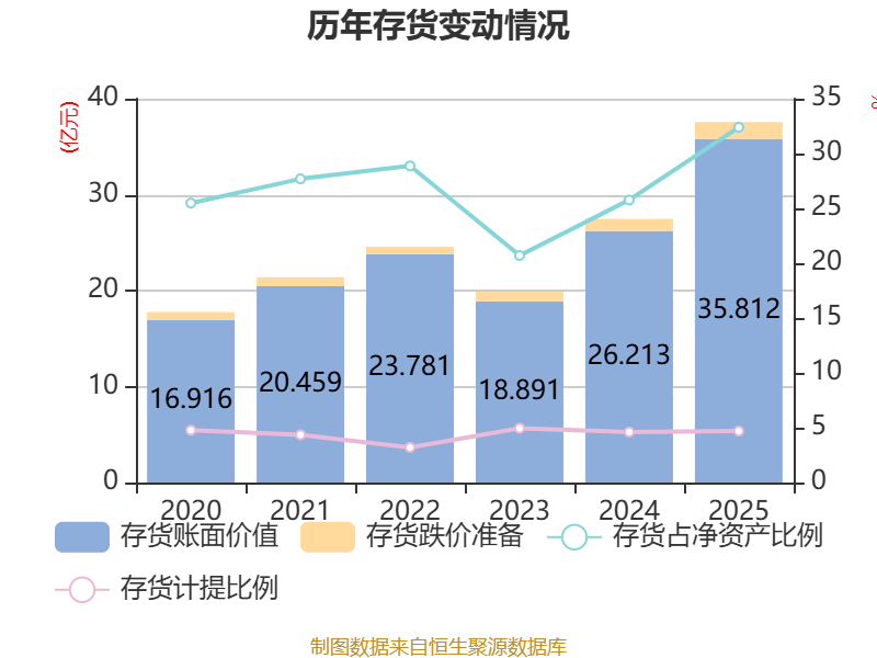 从存货变动来看,截至2025年末,公司存货账面价值为35.81亿元,占净资产的32.39%,较上年末增加9.6亿元。其中,存货跌价准备为1.76亿元,计提比例为4.69%。