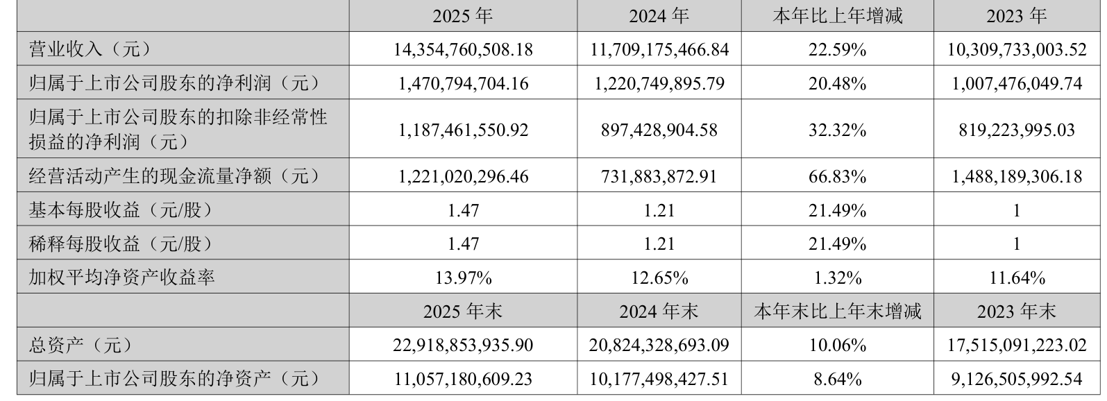 中证智能财讯华工科技(000988)3月26日披露2025年年度报告。2025年,公司实现营业总收入143.55亿元,同比增长22.59%;归母净利润14.71亿元,同比增长20.48%;扣非净利润11.87亿元,同比增长32.32%;经营活动产生的现金流量净额为12.21亿元,同比增长66.83%;报告期内,华工科技基本每股收益为1.47元,加权平均净资产收益率为13.97%。公司2025年度分配预案为:拟向全体股东每10股派现2.5元(含税)。