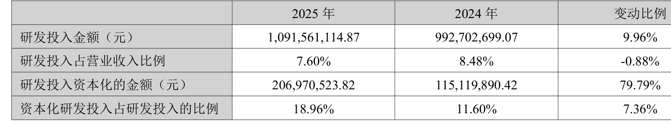 2025年全年,公司研发投入金额为10.92亿元,同比增长9.96%;研发投入占营业收入比例为7.6%,相比上年同期下降0.88个百分点。此外,公司全年研发投入资本化率为18.96%。