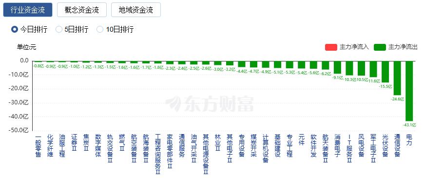 净流出方面,电力、通信设备、光伏设备等净流出排名靠前,其中电力净流出43.14亿元。