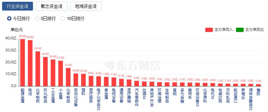 行业资金方面,截至收盘,能源金属、电池、化学制药等净流入排名靠前,其中能源金属净流入39.49亿。
