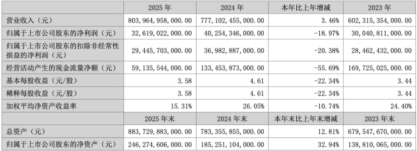 3月27日,比亚迪股份有限公司(比亚迪,002594.SZ;01211.HK)公告称,2025全年实现营收8039.65亿元,同比增长3.46%;归属于上市公司股东的净利润326.19亿元,同比下降18.97%;基本每股收益为3.58元;董事会审议通过的利润分配预案为向全体股东每10股派发现金红利3.58元(含税)。