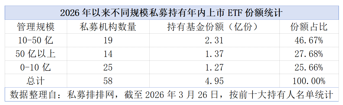 3月27日,私募排排网最新数据显示,截至2026年3月26日,年内已有58家私募机构现身45只新上市ETF的前十大持有人名单,合计持有份额约4.95亿份,显示私募机构借道ETF布局市场的热情持续升温。