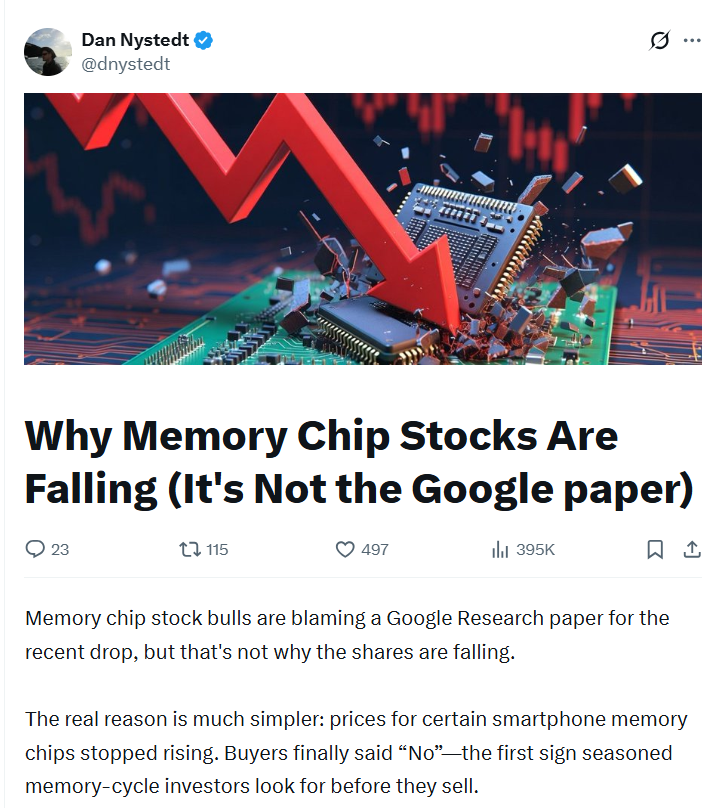 对于遵循传统周期的交易员而言,市场大跌并非那么简单。前记者、知名驻台半导体分析师Dan Nystedt指出,许多看多者将近期的暴跌归咎于谷歌的论文,但这只是表象。Dan认为真正的原因在于,部分智能手机内存芯片价格停止了上涨。