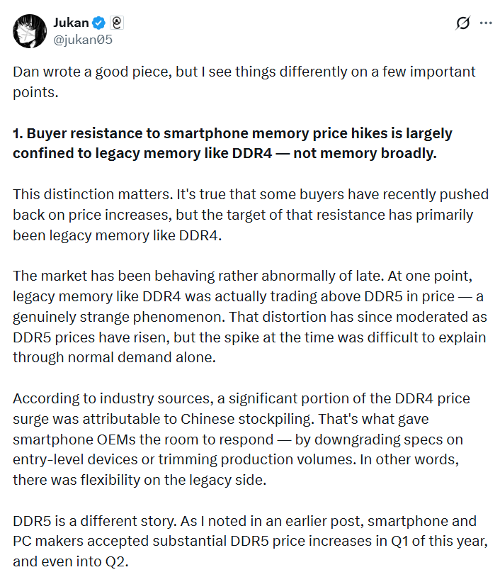 “但DDR5完全是另一回事。”Jukan指出。智能手机和PC制造商在今年一季度甚至二季度,都老老实实地接受了DDR5的大幅涨价。在当前的AI与高端设备生态中,DDR5不是一个可以讨价还价的谈判目标,而是买家即使支付溢价也必须确保的核心投入品。围绕DDR5构建的旗舰产品根本无法降低规格。