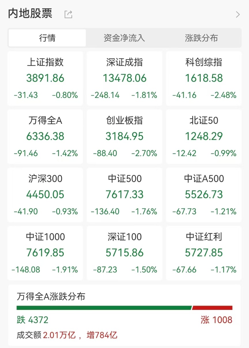 存储器、CPO等算力硬件产业链下挫,光伏、锂电池、半导体、AI应用概念股回调明显,化工、电力、煤炭、油气、农业板块跌幅靠前。全市场超4300股下跌。