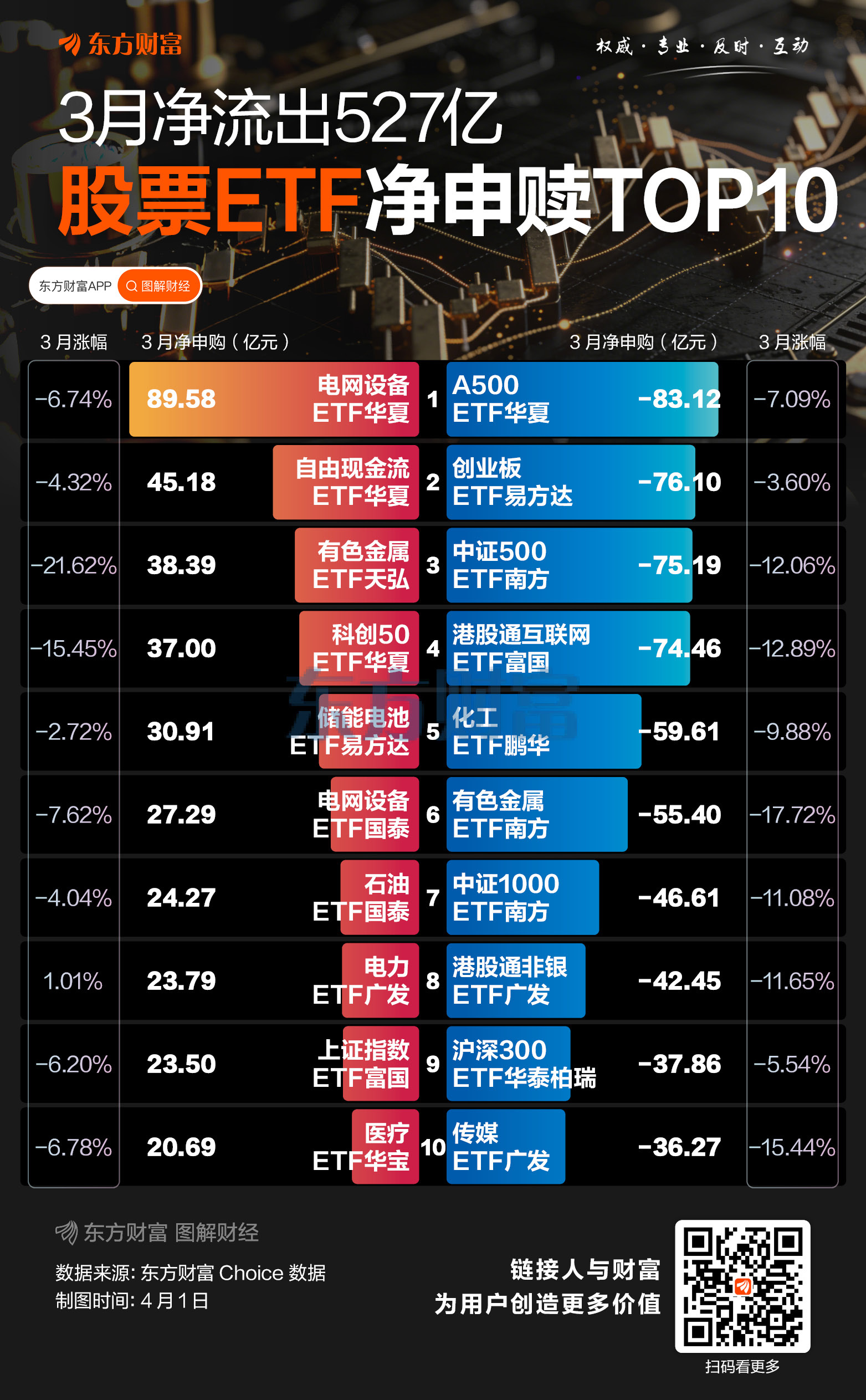 此外,在避险情绪和防御思维带动下,自由现金流ETF华夏净申购金额也位居前列,3月份净申购45.18亿元。此外,科创50指数当月大幅调整15.45%,资金净申购37亿元,抄底意图明显。