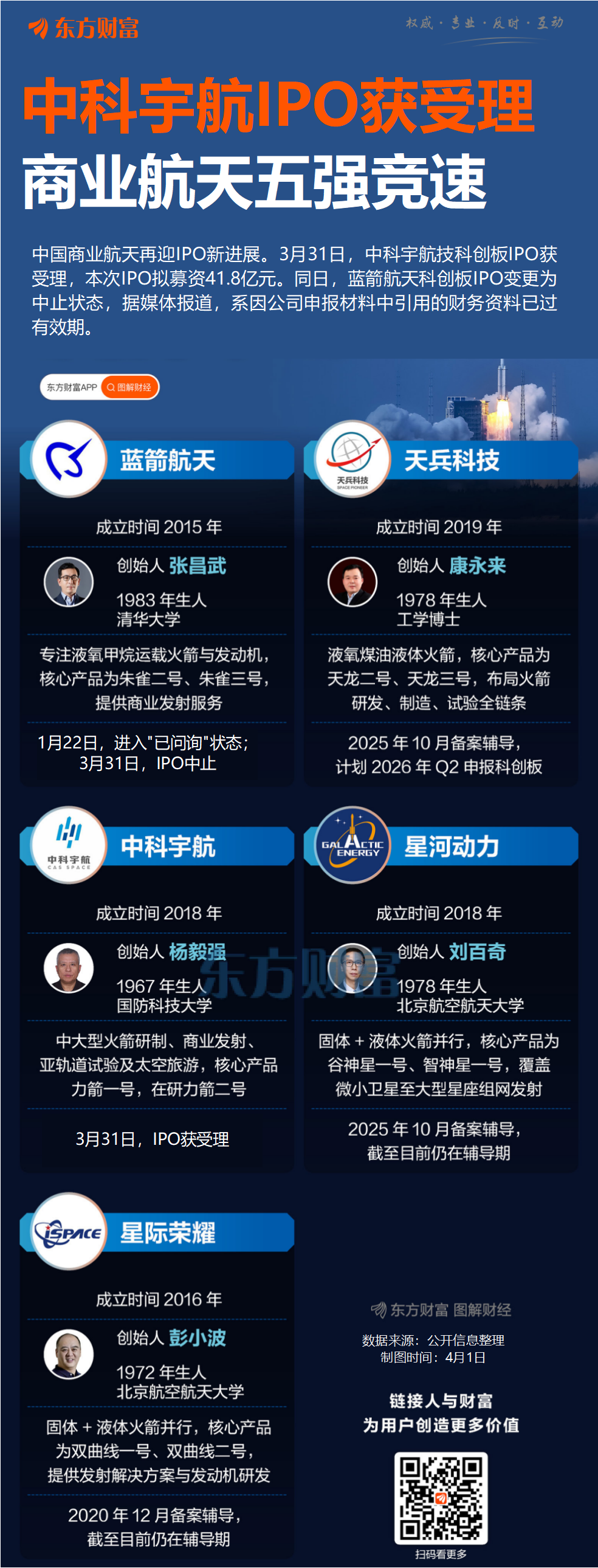 从蓝箭航天冲击上市进程来看,上交所官网显示,公司科创板IPO于2025年12月31日获得受理,2026年1月22日进入问询阶段。2026年3月31日,蓝箭航天IPO因发行上市申请文件中记载的财务资料已过有效期需要补充提交而中止。