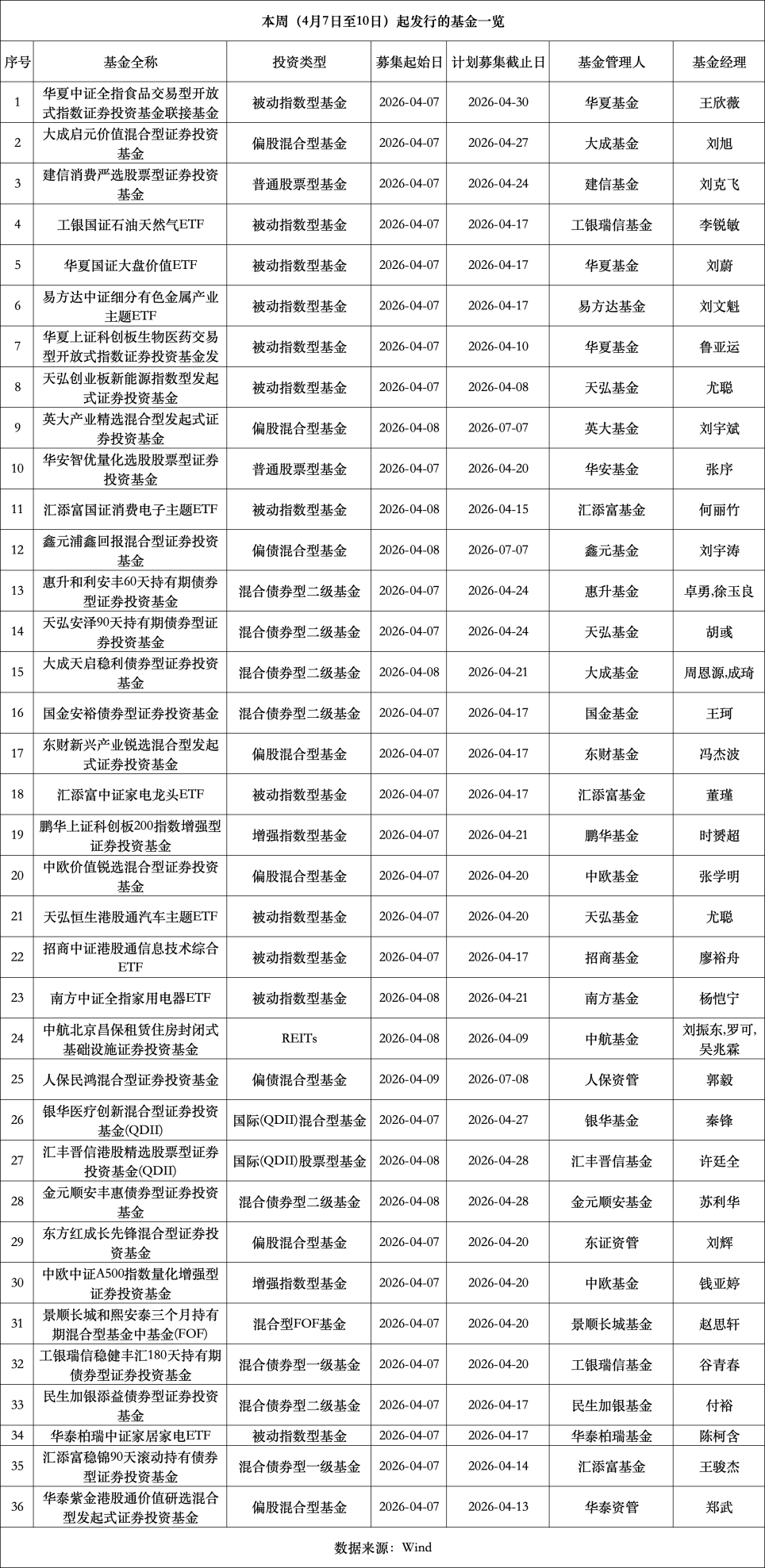 Wind数据显示,本周36只新基金中,27只在周二(4月7日)启动发行,占比高达75%;周三、周四分别有8只、1只基金开始认购,周五暂无新发。