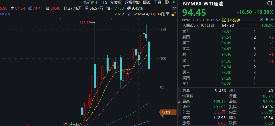 受到美以伊局势最新进展消息影响,国际市场原油价格开始“高台跳水”,WTI原油期货主力合约盘中跌幅超过16%,跌破95美元/桶。