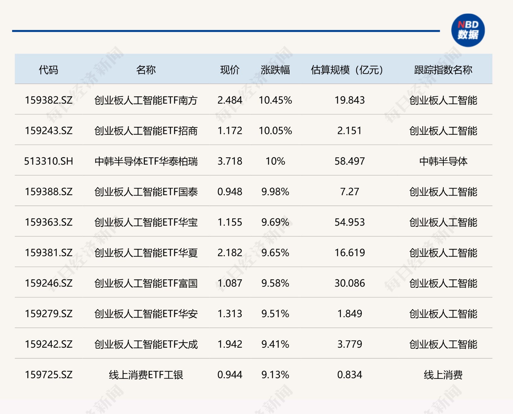 ETF涨跌幅方面,创业板人工智能相关ETF涨约10%。