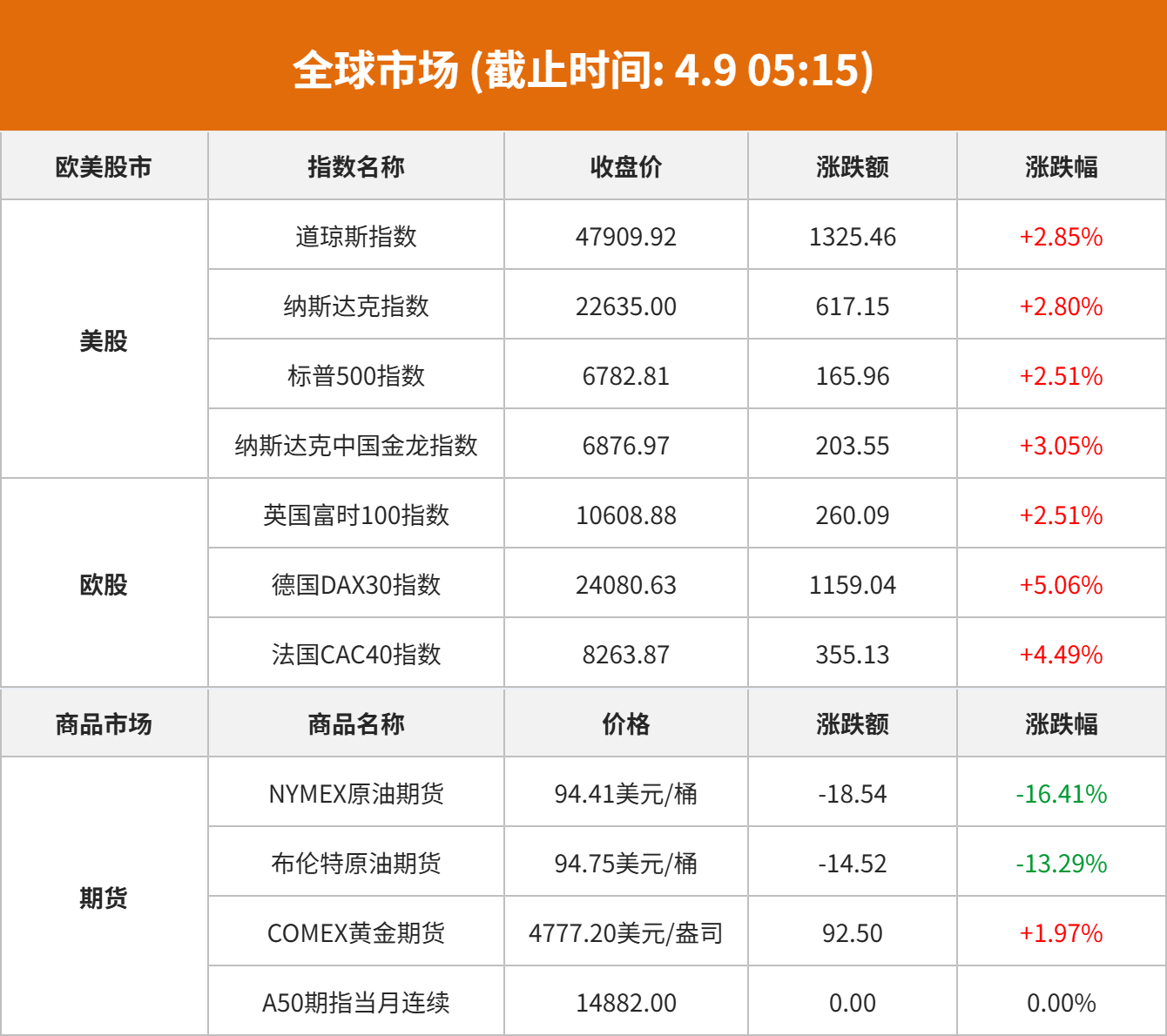 美股市场:美股三大指数04月08日收盘全线上涨,其中,纳指、标普500指数录得六连涨。截至收盘,道琼斯工业平均指数比前一交易日上涨1325.46点,收于47909.92点,涨幅为2.85%;标准普尔500种股票指数上涨165.96点,收于6782.81点,涨幅为2.51%;纳斯达克综合指数上涨617.15点,收于22635.0点,涨幅为2.8%。