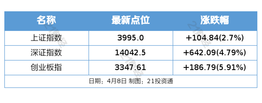 4月8日,市场集体反弹,沪指百点长阳,创业板指涨近6%、科创50指数涨超6%。截至收盘,沪指涨2.7%,深成指涨4.79%,创业板指涨5.91%。量能明显放大,沪深两市成交额2.43万亿元,较上一个交易日放量8201亿元。