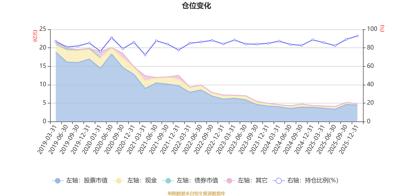 据定期报告数据统计,近三年平均股票仓位为86.17%,同类平均为87.73%。2025年末基金达到92.95%的最高仓位,2021年一季度末最低,为72.39%。