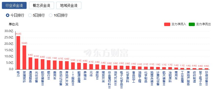 行业资金方面,截至收盘,电力、玻璃玻纤、通信服务等净流入排名靠前,其中电力净流入26.19亿。