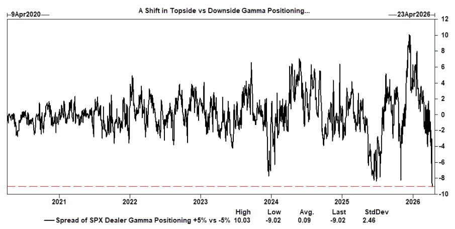 科技板块此前经历了激进的去风险化,仓位更为干净、敞口较轻,但基本面并未随价格同步恶化,形成"价格与盈利预期之间的缺口"。做市商处于短伽马状态,廉价的上行期权仍具吸引力,一旦仓位充分重置、价格趋于稳定,上行期权价格可能快速重定价。