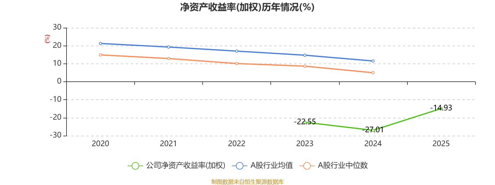 数据显示,2025年公司平均净资产收益率为-14.93%,较上年同期上升12.08个百分点。