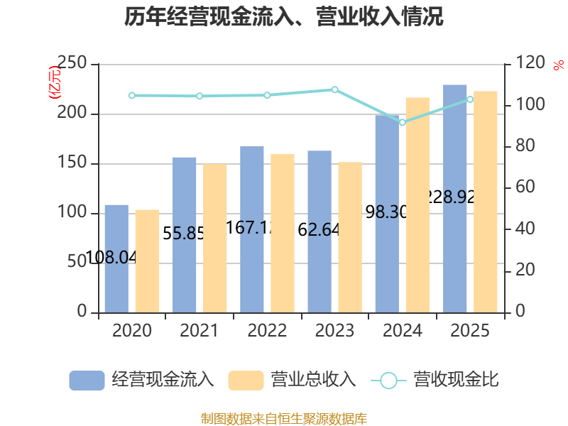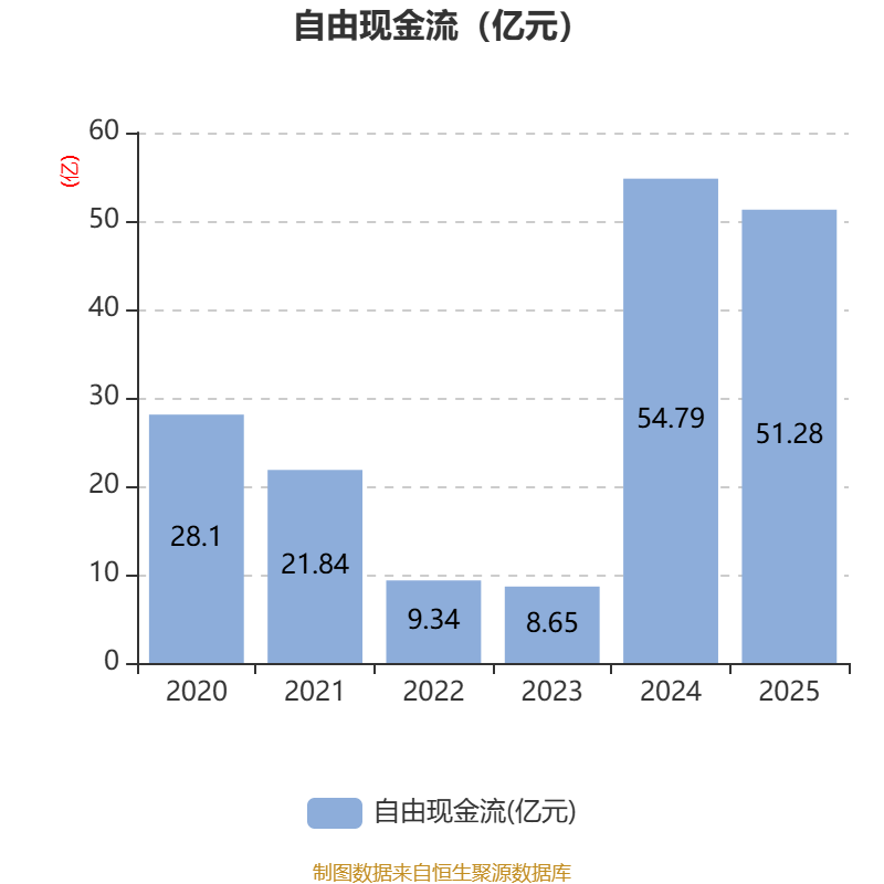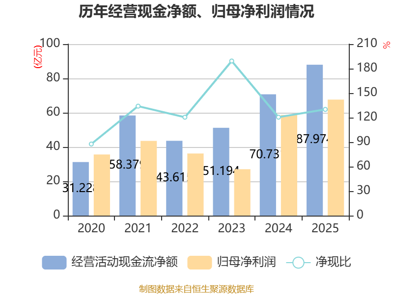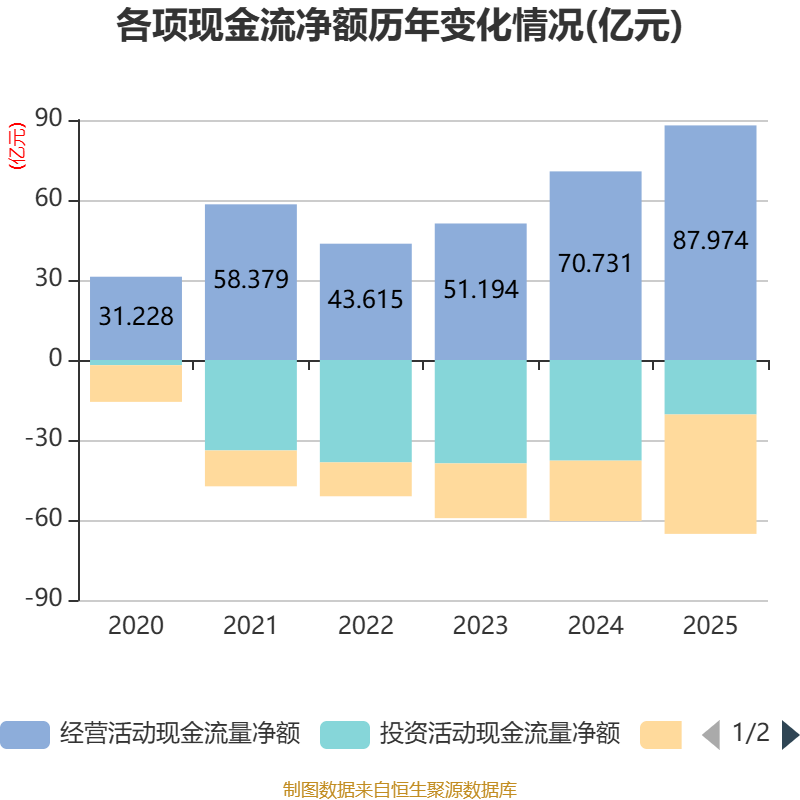 截至2025年,公司经营活动现金流净额为87.97亿元,同比增长24.38%;筹资活动现金流净额-44.78亿元,同比减少22.15亿元;投资活动现金流净额-20.43亿元,上年同期为-37.74亿元。
