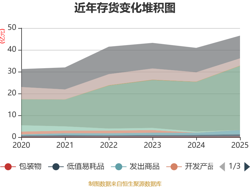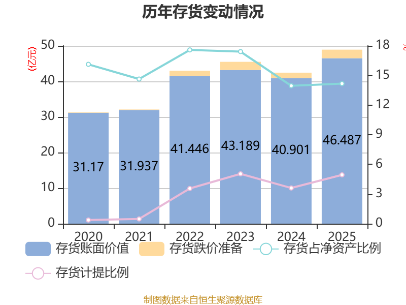 从存货变动来看,截至2025年末,公司存货账面价值为46.49亿元,占净资产的14.17%,较上年末增加5.59亿元。其中,存货跌价准备为2.42亿元,计提比例为4.94%。