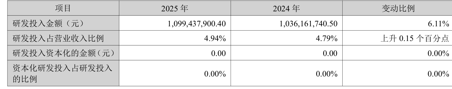 2025年全年,公司研发投入金额为10.99亿元,同比增长6.11%;研发投入占营业收入比例为4.94%,相比上年同期上升0.15个百分点。此外,公司全年研发投入资本化率为0%。