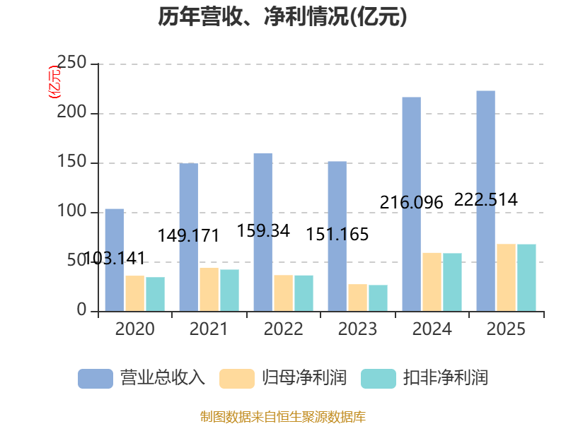 中证智能财讯新和成(002001)4月16日披露2025年年度报告。2025年,公司实现营业总收入222.51亿元,同比增长2.97%;归母净利润67.64亿元,同比增长15.26%;扣非净利润67.38亿元,同比增长15.59%;经营活动产生的现金流量净额为87.97亿元,同比增长24.38%;报告期内,新和成基本每股收益为2.21元,加权平均净资产收益率为21.87%。公司2025年度分配预案为:拟向全体股东每10股派现8元(含税)。