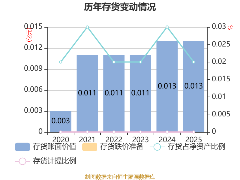 从存货变动来看,截至2025年末,公司存货账面价值为133.44万元,占净资产的0.02%,较上年末减少4213.08元。公司本期没有计提存货跌价准备。
