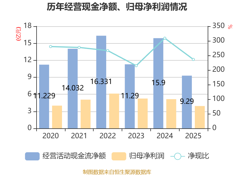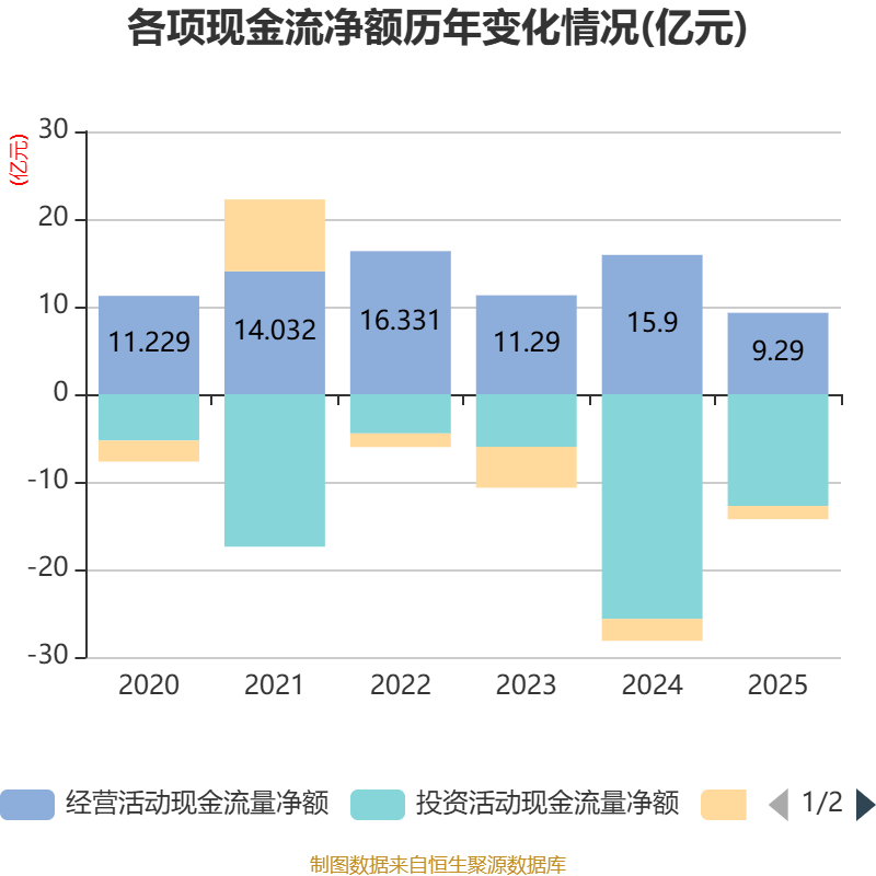 截至2025年,公司经营活动现金流净额为9.29亿元,同比下降41.57%;筹资活动现金流净额-1.52亿元,同比增加9827.38万元;投资活动现金流净额-12.75亿元,上年同期为-25.65亿元。