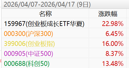 2026年4月17日A股市场分化,深强沪弱,创业板指在光模块、PCB板块上涨带动下创出新高,创业板成长ETF华夏(159967)涨超3%。近9个交易日领涨宽基指数,大幅跑赢创业板指数和A股主流宽基指数。
