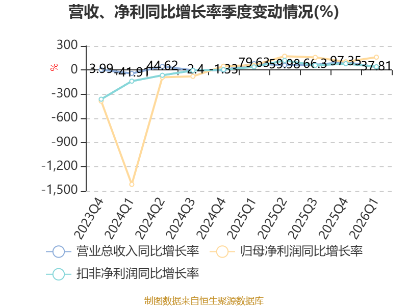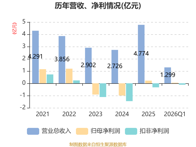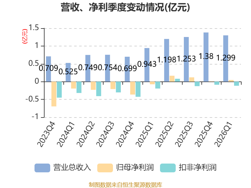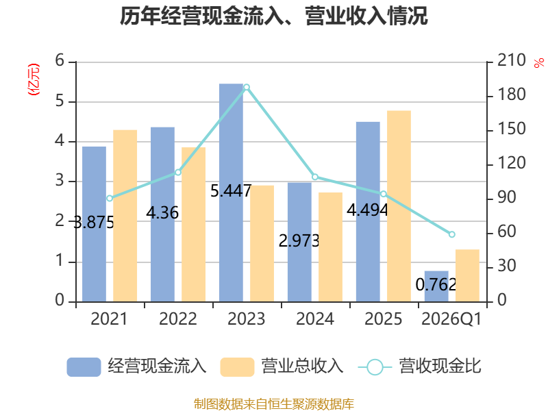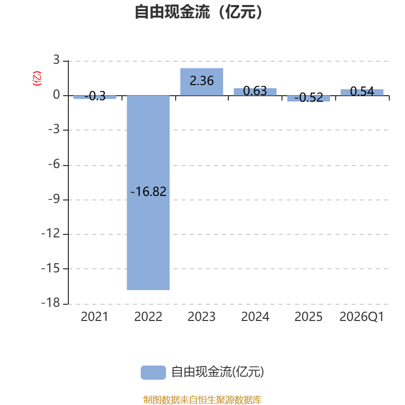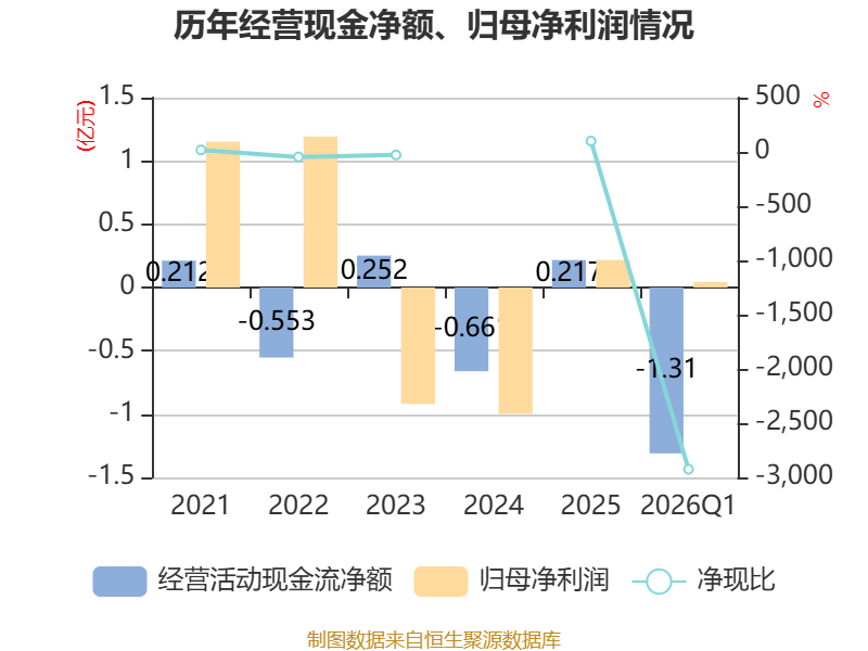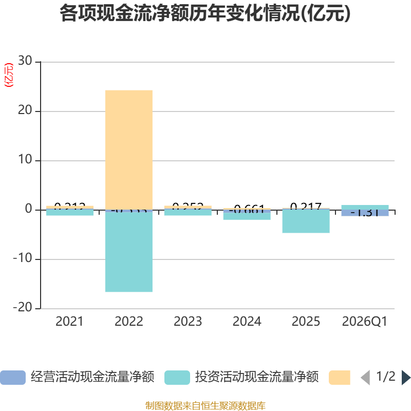 截至2026年一季度末,公司经营活动现金流净额为-1.31亿元,同比减少1.03亿元;筹资活动现金流净额-129.82万元,同比减少1363.11万元;投资活动现金流净额9352.71万元,上年同期为-1.87亿元。
