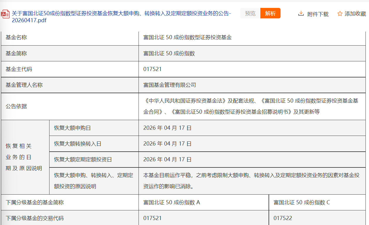 此前,在4月15日,博时基金公告称,自 2026年4月15日起,旗下博时北证50成份指数发起式基金取消单日单个基金账户单笔或累计的申购、转换转入、定期定额投资申请金额不得超过100万元(A,C 两类基金份额申请金额予以合计)的限制,恢复办理大额申购、转换转入、定期定额投资业务。