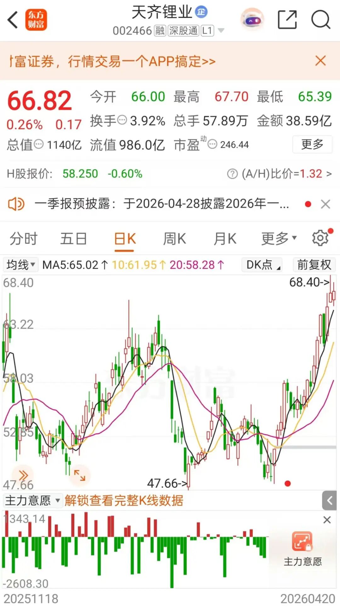 截至4月20日收盘,天齐锂业A股报66.82元/股,上涨0.26%,总市值超1000亿元。