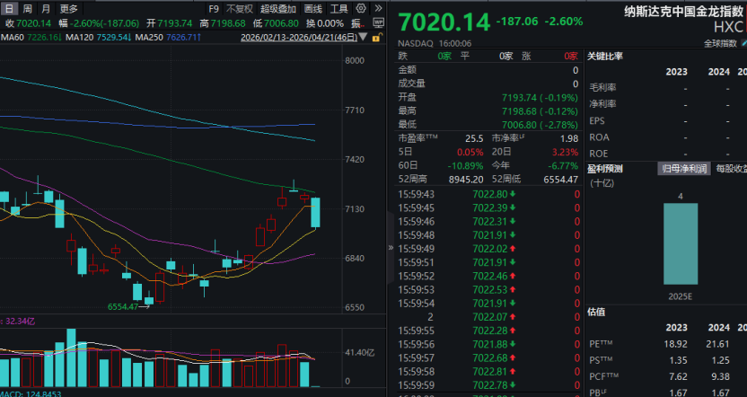 中概股整体大幅走低,纳斯达克中国金龙指数跌2.60%。