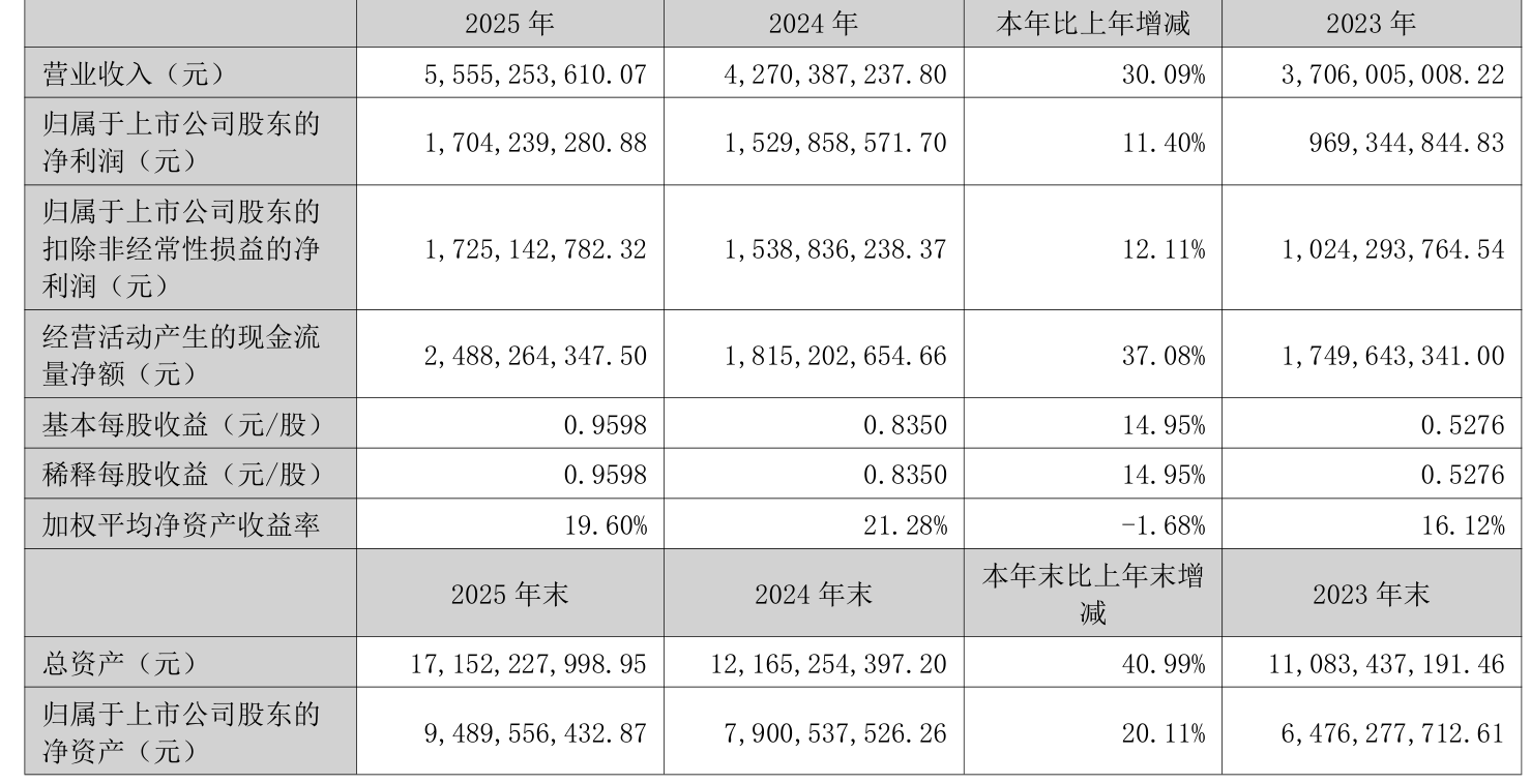 中证智能财讯兴业银锡(000426)4月22日披露2025年年度报告。2025年,公司实现营业总收入55.55亿元,同比增长30.09%;归母净利润17.04亿元,同比增长11.40%;扣非净利润17.25亿元,同比增长12.11%;经营活动产生的现金流量净额为24.88亿元,同比增长37.08%;报告期内,兴业银锡基本每股收益为0.9598元,加权平均净资产收益率为19.60%。公司2025年度分配预案为:拟向全体股东每10股派现1.1元(含税)。